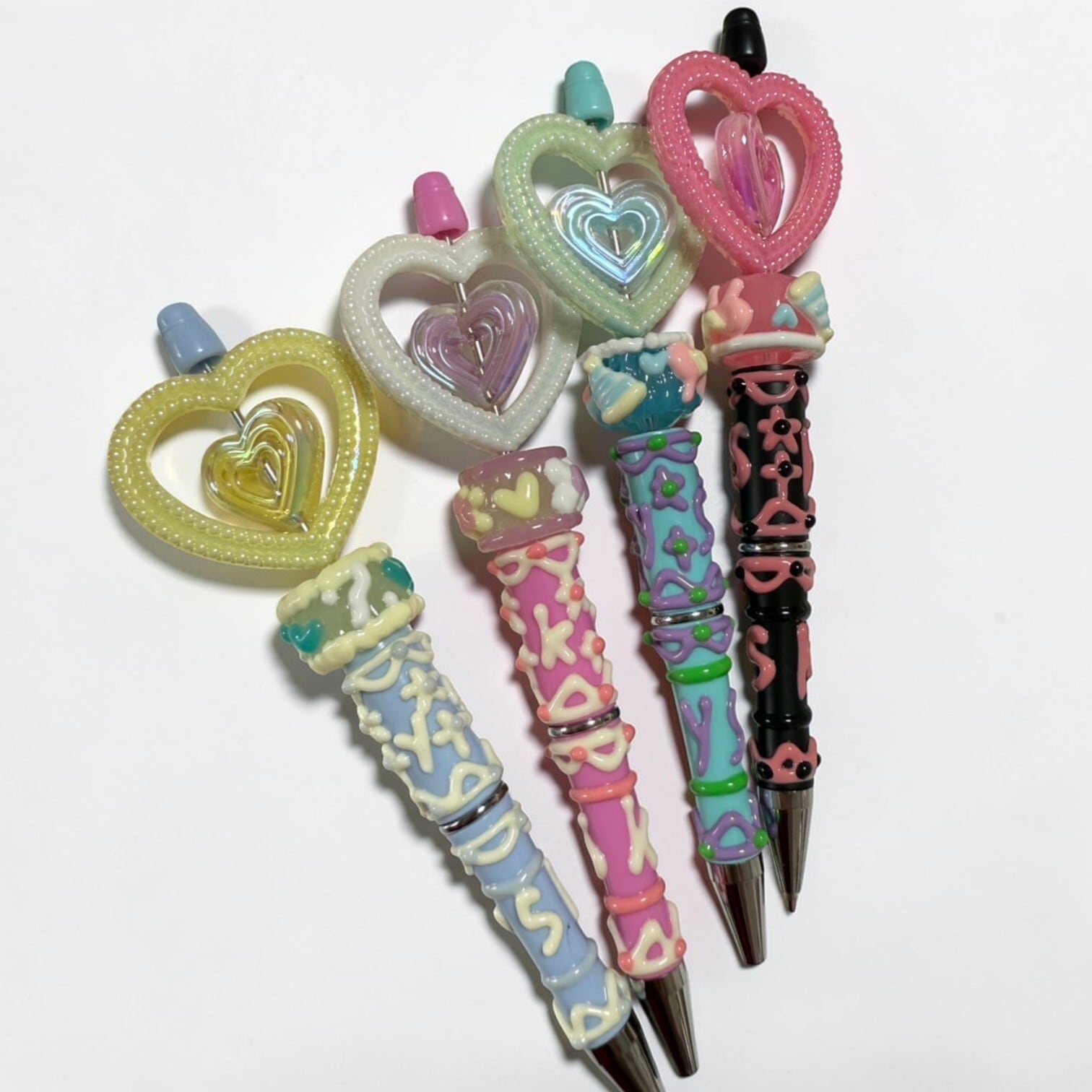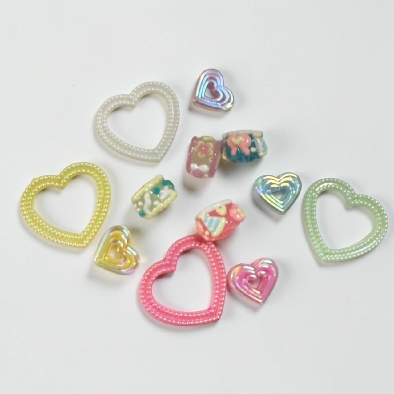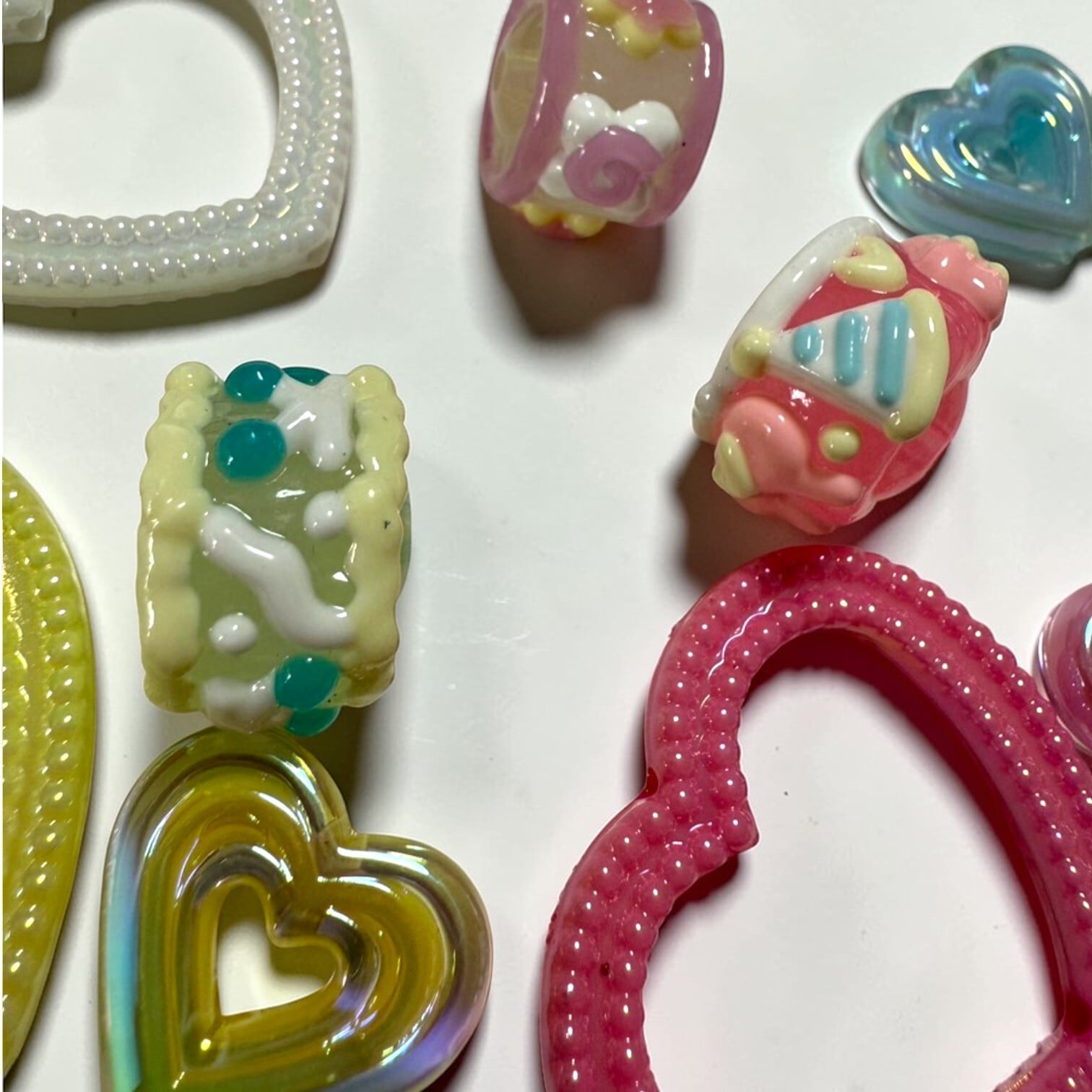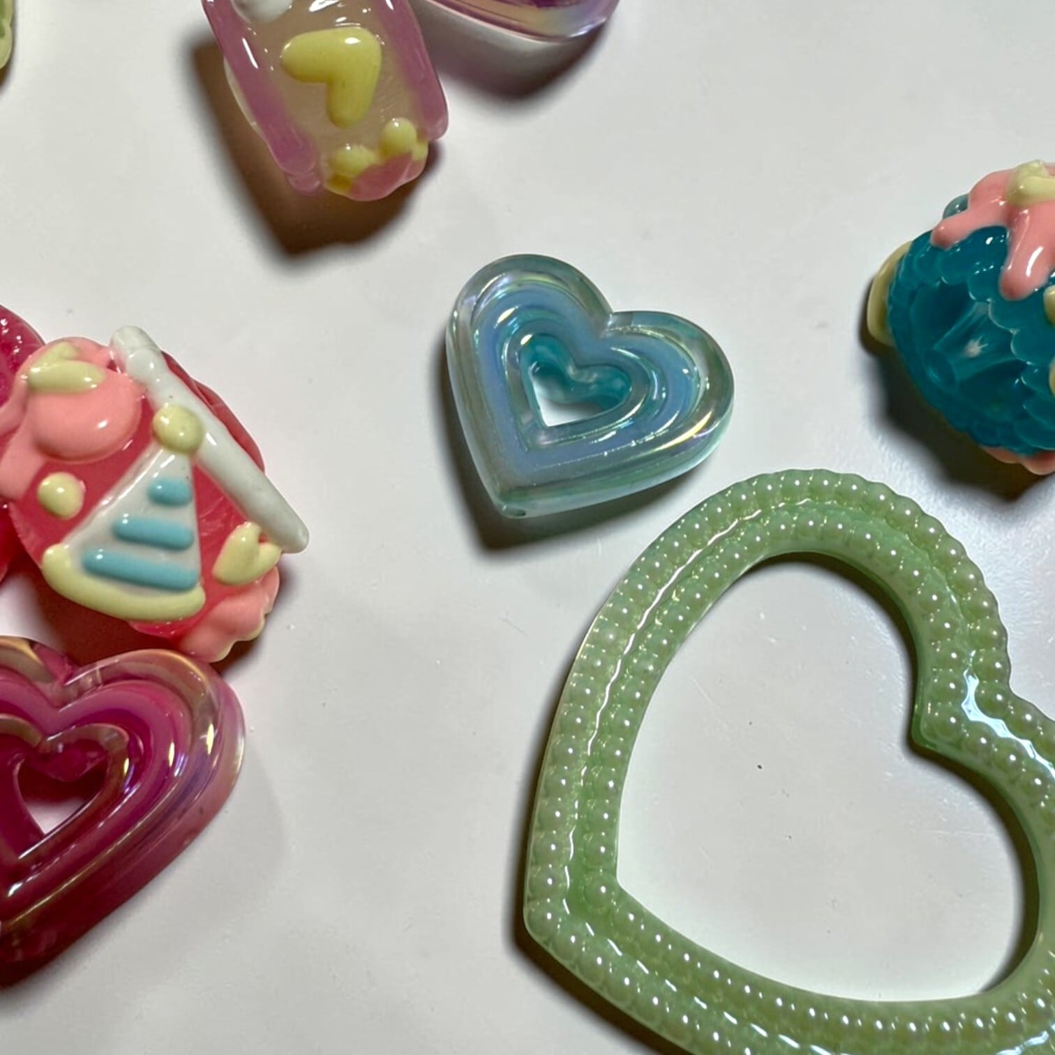 当店で人気のハート(大)のパーツとちゅるちゅるのハートとスイーツがモチーフのデコパーツの組み合わせです。
